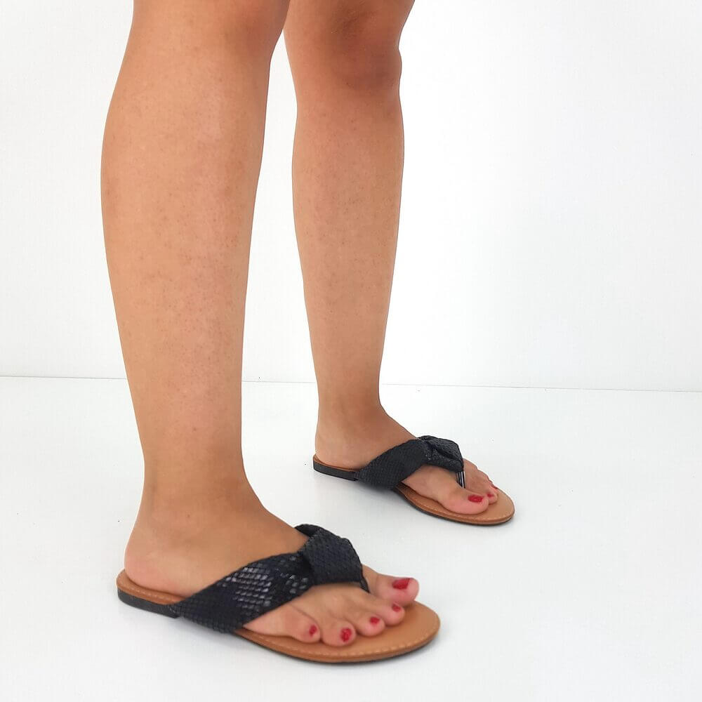Sandalo basso con infradito e tallone scoperto. Presenta una fascia anteriore in similpelle intrecciata. La composizione è in similpelle, il colore è nero e la calzata è regolare.
