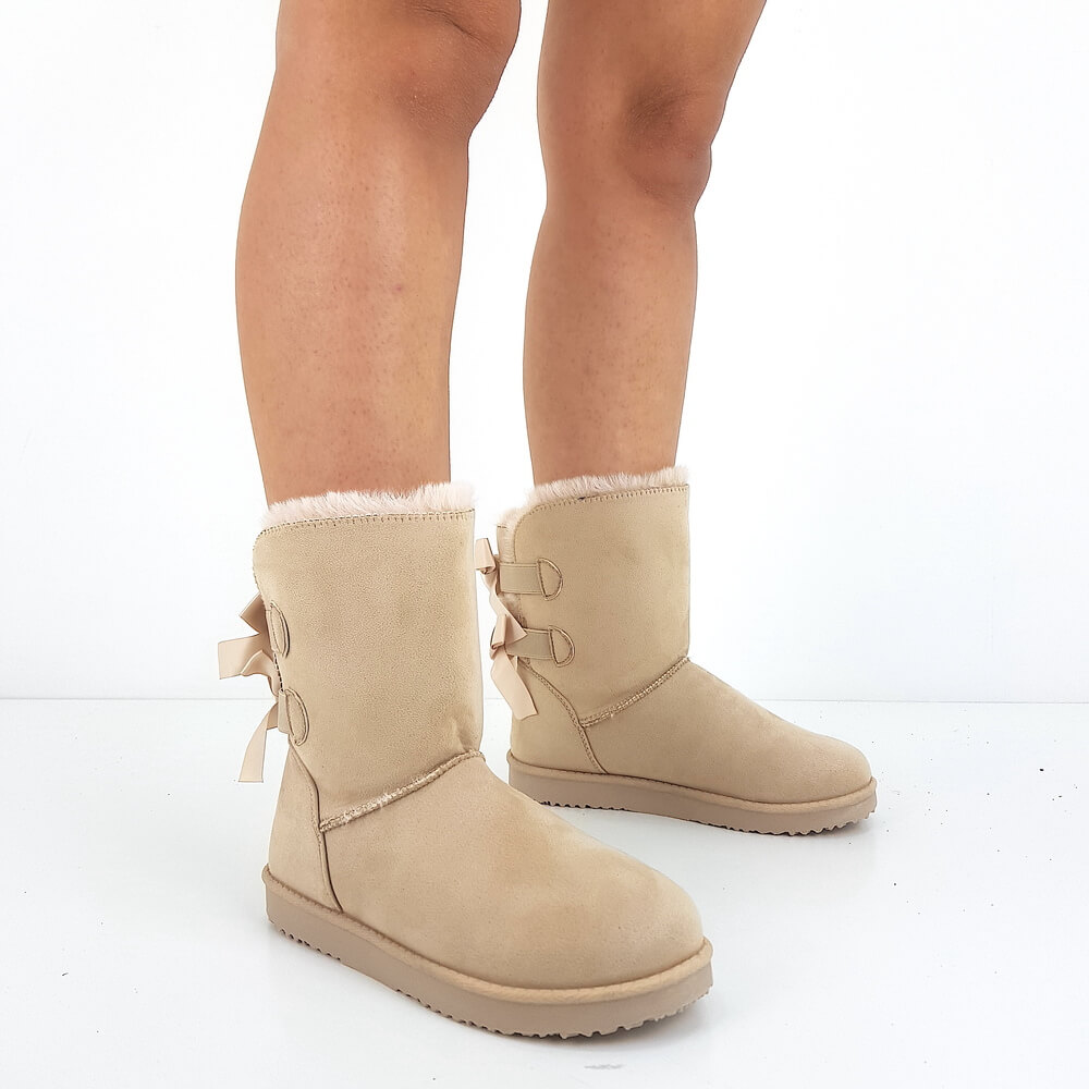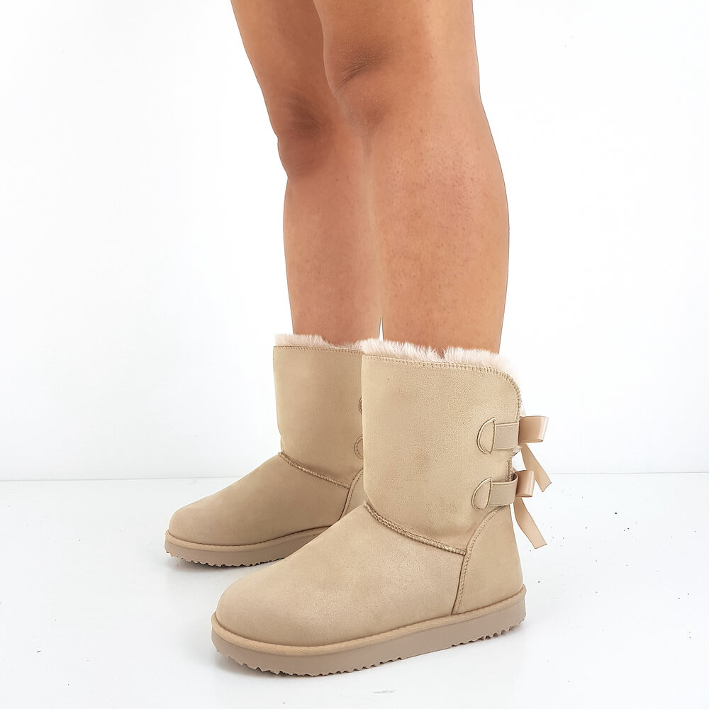 Stivaletti beige bassi da donna. Presentano una doppia fascia elastica con fiocco sul retro, mentre l’interno è rivestito di pellicciotto. Inolte l’altezza della para è di 2,5 cm. Infine la composizione è in eco-camoscio e la calzata è regolare.
