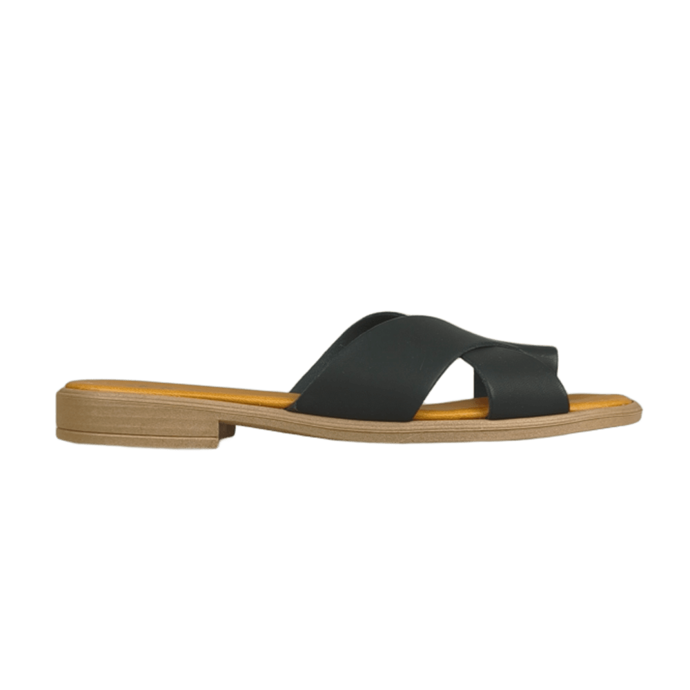 Sandalo infradito da donna di produzione made in Italy che presenta un comodo plantare in memory. La struttura presenta due fasce in similpelle incrociate. La tomaia è in similpelle di colore nero. Infine la calzata è regolare.