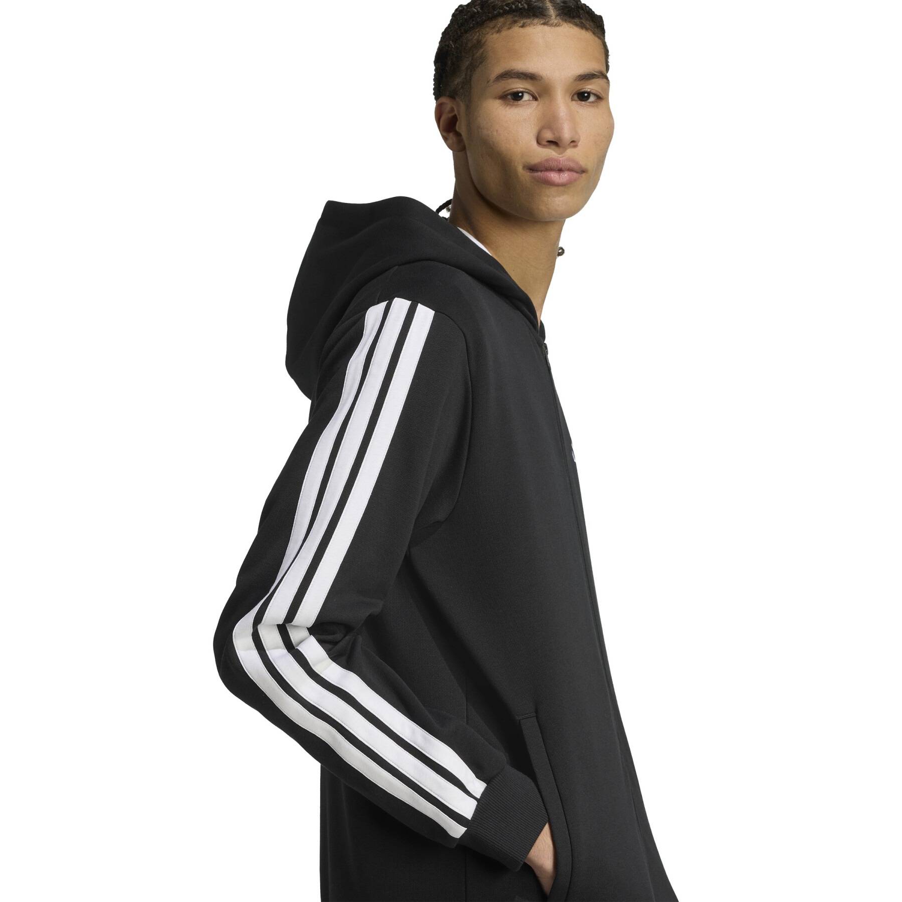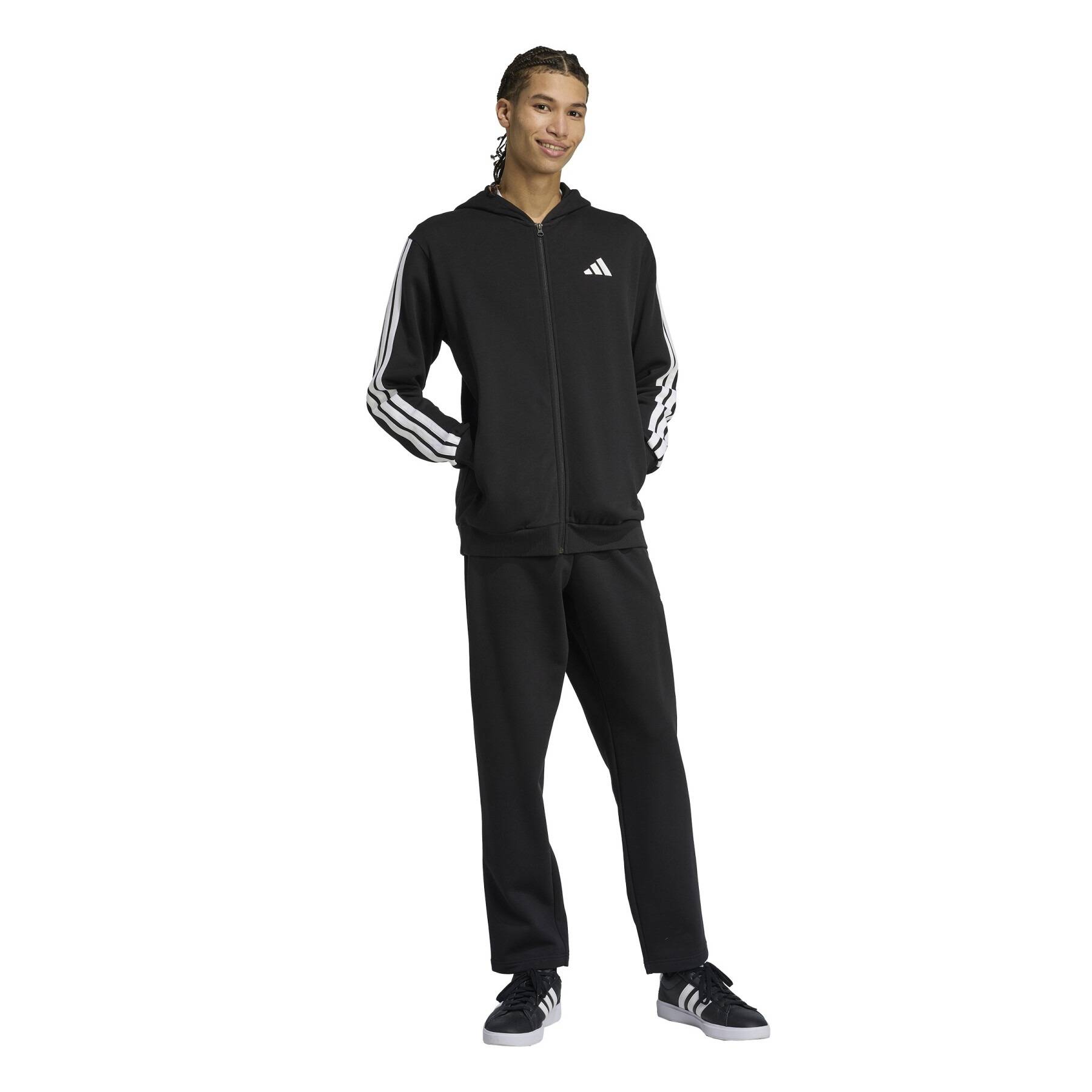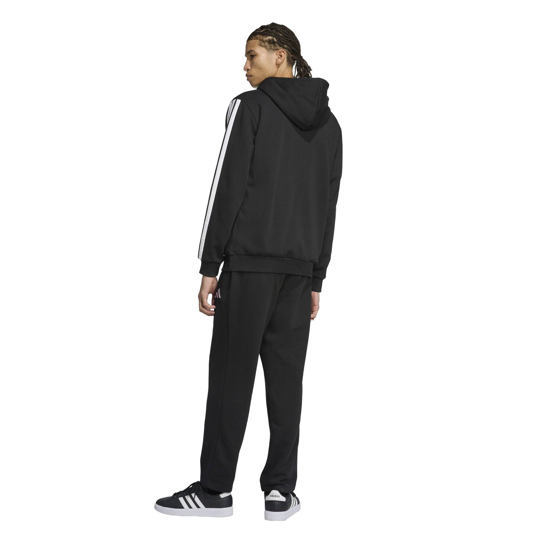 Il completo è dotato di un pantalone a fondo aperto con vita alta e di un top con cappuccio e zip su tutta la lunghezza. Questo modello è stato realizzato in morbido e incredibilmente comodo felpato, che ti garantirà calore e benessere. Le 3 bande sulle maniche e i loghi discreti in stile sportswear conferiscono a questo completino un look distintivo.
